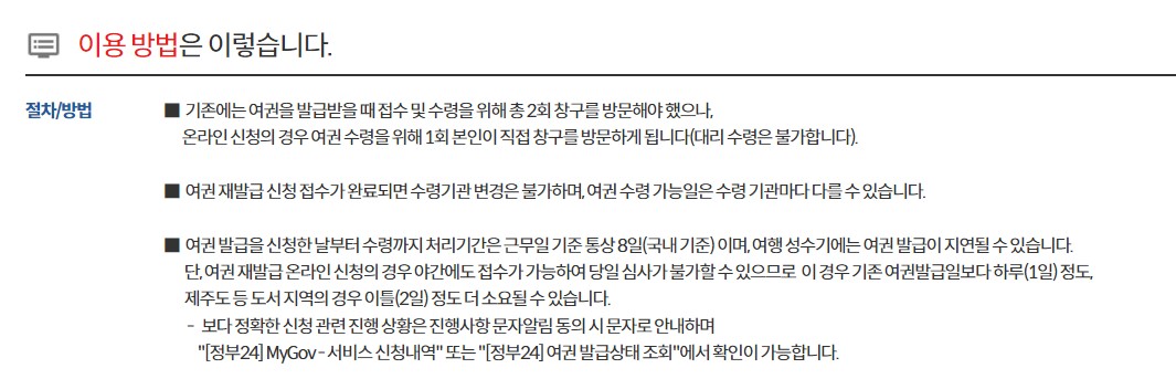 - 유효기간이 만료된 경우 : 여권 없이 신분증만 지참하여 여권 발급기관 방문