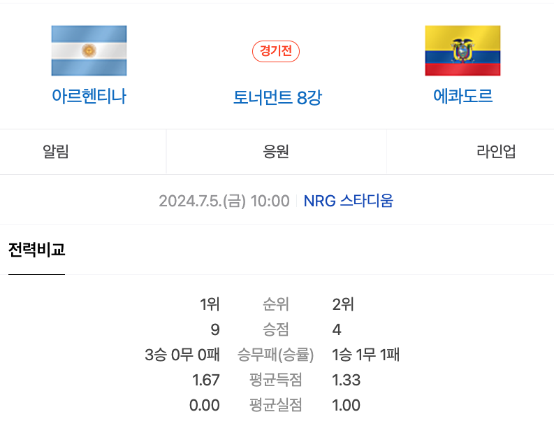 이번 코파 아메리카 2024의 아르헨티나 에콰도르전은 7월 5일 금요일 오전 10시에 시작됩니다.